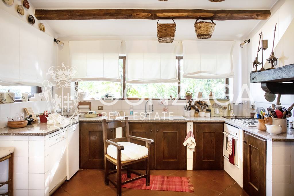 La cucina, rustica e funzionale, si apre sul verde circostante, mentre le camere da letto offrono atmosfere intime e rilassanti.